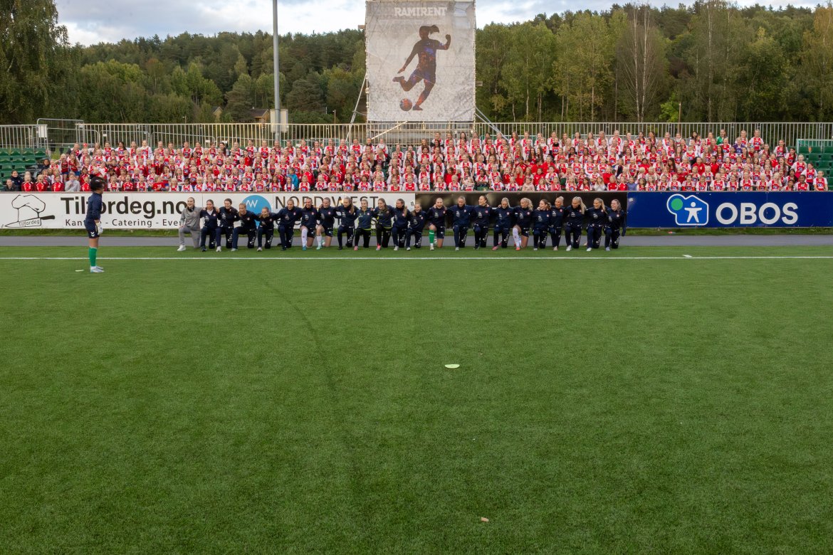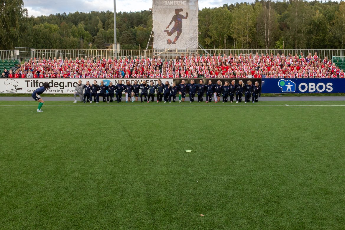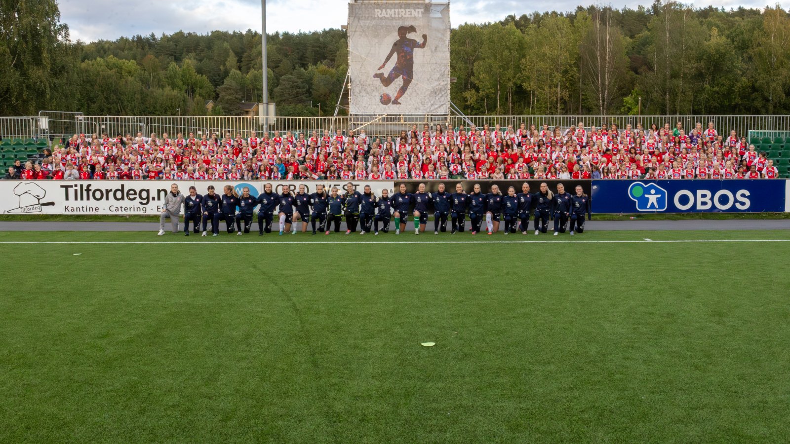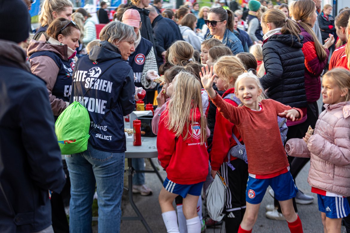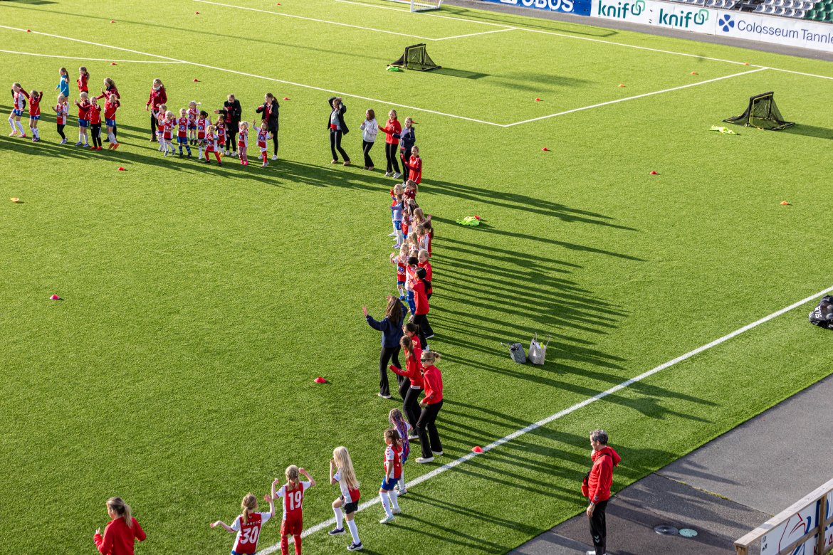 Etter treningsøkten ble alle samlet på tribunen solsiden for et stort fellesbilde, før kvelden fortsatte med Fan Zone foran stadion. Her ble det servert kveldsmat fra vår samarbeidspartner Kiwi, og skapt liv rundt damelagets kamp, som satte et verdig punktum for en minnerik kveld.